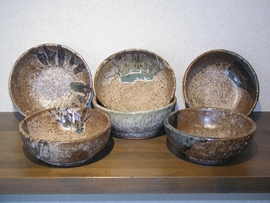 | 作者★里井さん シブイッ!これらは全て登り窯にて焼成した作品です。昨年末開催された越前登り窯体験に参加された際の作品です。記念になる作品ですね。 |