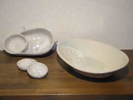 | 作者★竹森さん 作ってる間にウサギになりました(左上) スパッタリングで呉須を散らして薄っすら模様をつけてあります。以前にも揃いの食器を作られているのでシリーズものです。 |