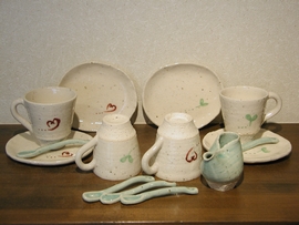 | 作者★高本さん 現在電動ロクロ猛特訓中の高本さんですが、早くもこんなに素晴らしいティーセットを作られました。電動のキャリアはまだ浅いですが、赤丸急上昇です↑ \(^o^)/ 今後に更なる期待です。 |